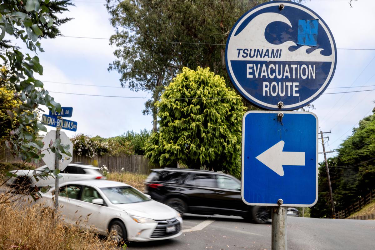 Un panneau indiquant l’itinéraire d’évacuation en cas de tsunami à Bolinas, Californie, le 30 juillet 2025.
